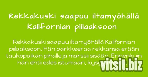 Rekkakuski saapuu iltamyöhällä Kalifornian piilaaksoon. Hän parkkeeraa rekkansa erään taukopaikan pihalle ja marssii sisään. Ennenkuin hän ehtii edes istumaan, kysyy baarimikko rekkakuskilta: