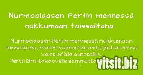 Nurmoolaasen Pertin mennessä nukkumaan toissailtana, hänen vaimonsa kertoi jättäneensä valot päälle autotalliin.