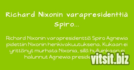 Richard Nixonin varapresidenttiä Spiro Agnewia pidettiin Nixonin henkivakuutuksena. Kukaan ei yrittänyt murhata Nixonia, sillä hulluinkaan ei halunnut Agnewia presidentiksi. Eräänä päivänä Agnewia kohtasi ikävä onnettomuus: hänen kodissaan oli tulipalo. Kukaan ei onneksi loukkaantunut, mutta varapresidentti oli silti pahoillaan tapahtuneesta. Häntä harmitti erityisesti se, että palossa tuhoutui hänen koko kirjastonsa, jonka kirjoista toinen oli vasta puoliksi väritetty.