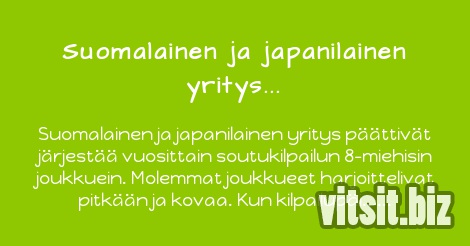 Suomalainen ja japanilainen yritys päättivät järjestää vuosittain soutukilpailun 8-miehisin joukkuein. Molemmat joukkueet harjoittelivat pitkään ja kovaa. Kun kilpailupäivä tuli, molemmat joukkueet olivat mielestään huippukunnossa, mutta japanilaiset voittivat ylivoimaisesti kilometrillä.