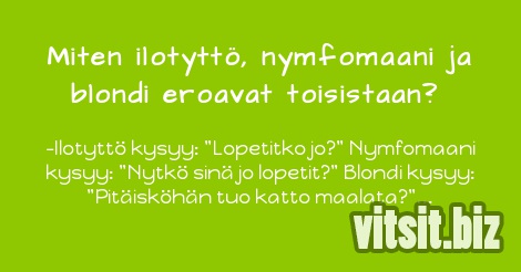 -Ilotyttö kysyy: "Lopetitko jo?" Nymfomaani kysyy: "Nytkö sinä jo lopetit?" Blondi kysyy: "Pitäisköhän tuo katto maalata?"