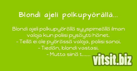 Blondi ajeli polkupyörällä syyspimeällä ilman valoja kun poliisi pysäytti hänet.