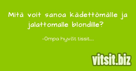 Tarjoilija blondeille: -Anteeksi, mutta ravintolassamme ei saa syödä omia eväitä. www.vitsit.biz Blondit katsoivat toisiaan hetken ja vaihtoivat eväänsä