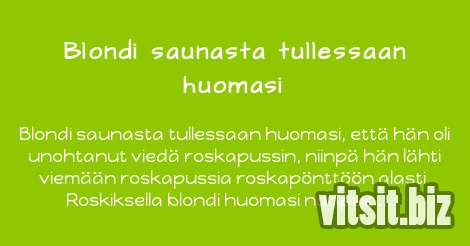 Blondi saunasta tullessaan huomasi, että hän oli unohtanut viedä roskapussin, niinpä hän lähti viemään roskapussia roskapönttöön alasti. Roskiksella blondi huomasi naapurin miehen, hän työnsi äkkiä päänsä roskikseen, jottei häntä tunnistettaisi. Naapurin mies innostui, otti ja nai takaapäin sen koommin kyselemättä. Kotonaan mies sanoi vaimolleen, että et uskokkaan kuinka hyvää tavaraa ihmiset heittävät roskikseen