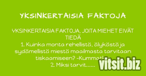 6. Kuinka monta miestä tarvitaan WC-paperirullan vaihtoon? -Ei yhtään, miehet eivät vaihda WC-paperirullia.