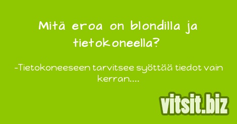 - Kumpaankin mennään sisään puskureiden kokoonnähden pienestä aukosta. www.vitsit.biz 99.Tietokilpailussa kysyttyä: - Mistä lasisilmä on tehty? - Vastaajana Blondi X: - (pitkää ja harra [...]