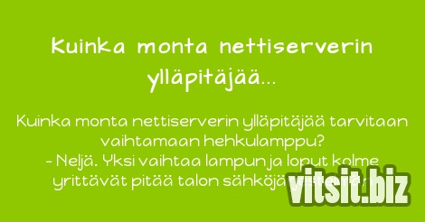 Kuinka monta nettiserverin ylläpitäjää tarvitaan vaihtamaan hehkulamppu? - Neljä. Yksi vaihtaa lampun ja loput kolme yrittävät pitää talon sähköjärjestelmän pystyssä.