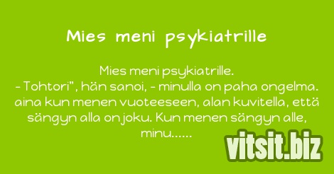 - Tohtori", hän sanoi, - minulla on paha ongelma. aina kun menen vuoteeseen, alan kuvitella, että sängyn alla on joku. Kun menen sängyn alle, minusta tuntuu, että sängyn päällä on joku. Sängyn alla, sängyn päällä, vuoron perään. Minä tulen hulluksi!