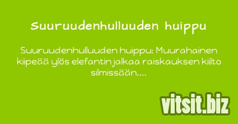 Suuruudenhulluuden huippu: Muurahainen kiipeää ylös elefantin jalkaa raiskauksen kiilto silmissään. www.vitsit.biz