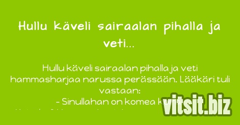 Hullu käveli sairaalan pihalla ja veti hammasharjaa narussa perässään. Lääkäri tuli vastaan: