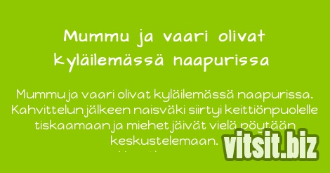 Mummu ja vaari olivat kyläilemässä naapurissa. Kahvittelun jälkeen naisväki siirtyi keittiönpuolelle tiskaamaan ja miehet jäivät vielä pöytään keskustelemaan.