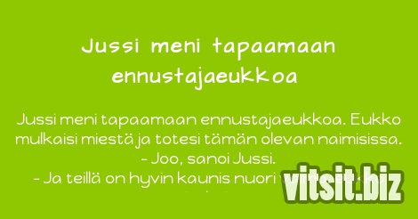 Jussi meni tapaamaan ennustajaeukkoa. Eukko mulkaisi miestä ja totesi tämän olevan naimisissa.