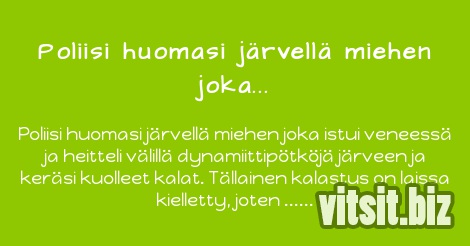 Poliisi huomasi järvellä miehen joka istui veneessä ja heitteli välillä dynamiittipötköjä järveen ja keräsi kuolleet kalat. Tällainen kalastus on laissa kielletty, joten poliisi työnsi vartioveneen veteen ja souti miehen viereen.