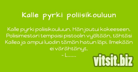 Kalle pyrki poliisikouluun. Hän joutui kokeeseen. Poliisimestari tempaisi pistoolin vyöltään, tähtäsi Kallea ja ampui luodin tämän hatun läpi. Ilmekään ei värähtänyt.