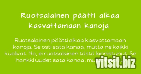 Ruotsalainen päätti alkaa kasvattamaan kanoja. Se osti sata kanaa, mutta ne kaikki kuolivat. No, ei ruotsalainen tästä lannistunut. Se hankki uudet sata kanaa, mutta nekin kaikki kuolivat. Kolmannelle parvelle kävi myös samoin.