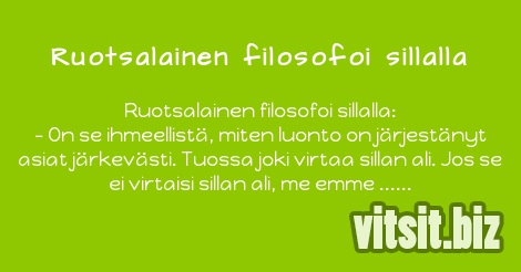 Ruotsalainen filosofoi sillalla: - On se ihmeellistä, miten luonto on järjestänyt asiat järkevästi. Tuossa joki virtaa sillan ali. Jos se ei virtaisi sillan ali, me emme pääsisi siltaa pitkin sen yli.