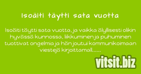 Isoäiti täytti sata vuotta, ja vaikka älyllisesti olikin hyvässä kunnossa, liikkuminen ja puhuminen tuottivat ongelmia ja hän joutui kommunikoimaan viestejä kirjoittamalla.