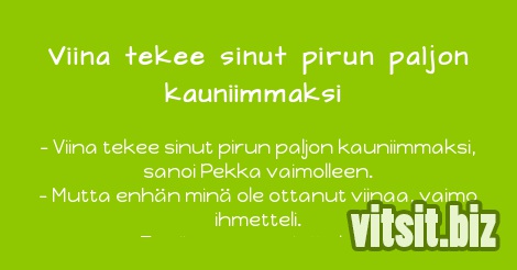 - Viina tekee sinut pirun paljon kauniimmaksi, sanoi Pekka vaimolleen. - Mutta enhän minä ole ottanut viinaa, vaimo ihmetteli. - Et niin, mutta minä olen.